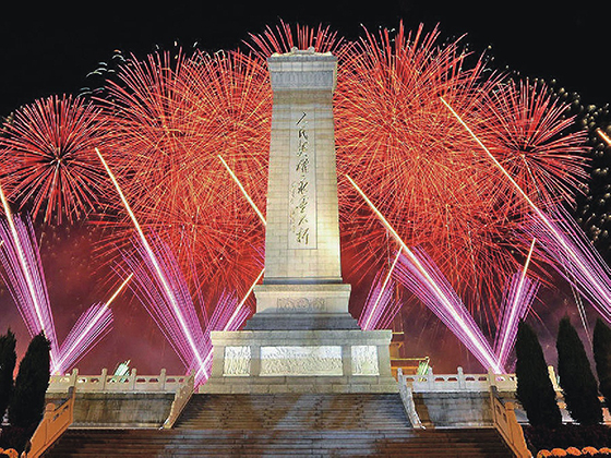 礼花、灯光映衬下的人民英雄纪念碑