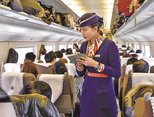 高铁列车员正在核对乘客的票务信息