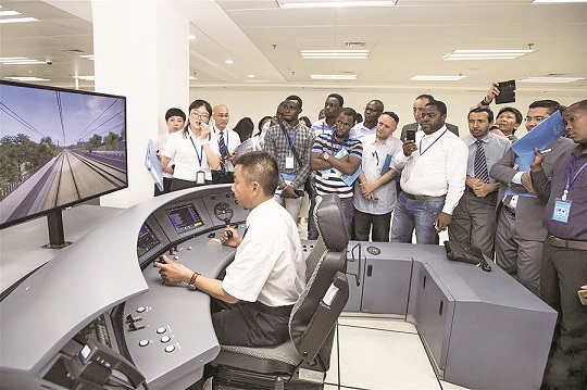 武汉高铁训练段的工作人员向外国学员示范模拟驾驶高铁